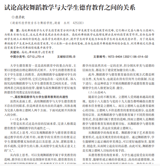 高校舞蹈教学与大学生德育教育分别归属于审美教育与道德教育的范畴,它们都以完善人格与立德树人 为根本目标与追求,这也是两者表现出来的共通性。高校的舞蹈教学也能够发挥出良好的德育教育作用,具体包括帮 助学生树立正确的价值观念、培养学生的团队意识、提升学生的审美能力和培养学生的自我规范意识等。为了使高校 舞蹈教学产生更加优良的德育效果,可以采取一些必要的策略,具体包括提升舞蹈教师的综合能力、利用舞蹈文化渗透 德育教育和利用舞蹈情境展开教学等。