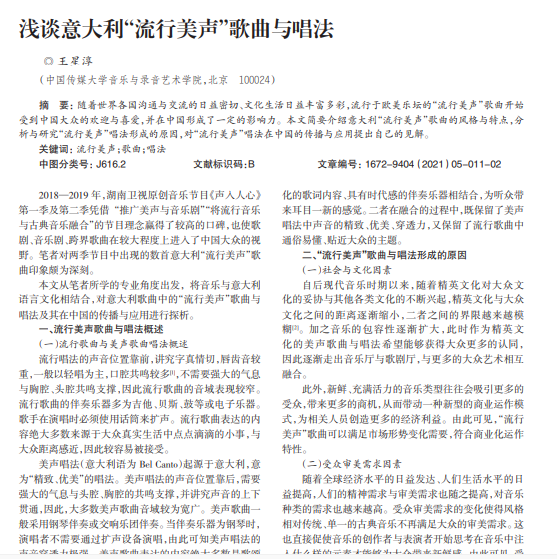 随着世界各国沟通与交流的日益密切、文化生活日益丰富多彩,流行于欧美乐坛的“流行美声”歌曲开始 受到中国大众的欢迎与喜爱,并在中国形成了一定的影响力。本文简要介绍意大利“流行美声”歌曲的风格与特点,分 析与研究“流行美声”唱法形成的原因,对“流行美声”唱法在中国的传播与应用提出自己的见解。
