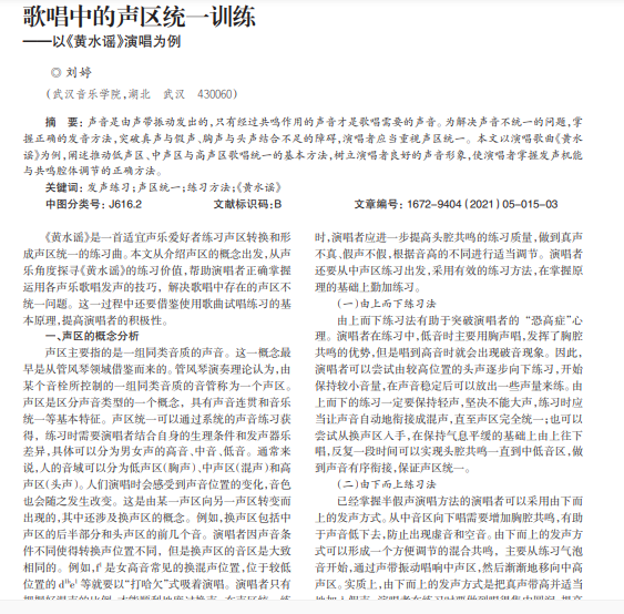 声音是由声带振动发出的,只有经过共鸣作用的声音才是歌唱需要的声音。为解决声音不统一的问题,掌 握正确的发音方法,突破真声与假声、胸声与头声结合不足的障碍,演唱者应当重视声区统一。本文以演唱歌曲《黄水 谣》为例,阐述推动低声区、中声区与高声区歌唱统一的基本方法,树立演唱者良好的声音形象,使演唱者掌握发声机能 与共鸣腔体调节的正确方法。