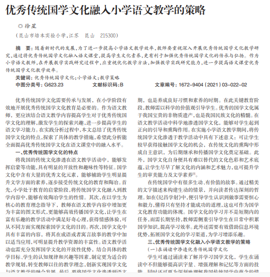 随着新时代的发展,为了进一步提高小学语文教学效率,教师要重视深入开展优秀传统国学文化教学研 究,通过将优秀传统国学文化融入语文课堂,提高学生文化素养,更有利于加强优秀传统国学文化的传承与弘扬。作为 小学语文教师,在开展教学实践研究过程中,应重视优化教学方法,加强教学实践研究能力,进一步提高语文课堂优秀 传统国学文化教学效率。