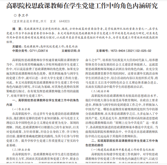 思政课教师是宣讲党的理论、路线、方针和政策的重要指导者,是学校教师队伍的重要力量之一,在学生 党建工作当中承担着重要责任和任务。本文对高职院校思政课教师在学生党建工作中的角色内涵进行研究,对其角色 作用和资源优势的有效发挥进行探讨,以此提升其在学校基层党组织中的战斗力,为学生党建工作有效性的提高提供 保障。