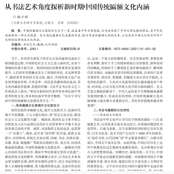 中国的匾额文化集综合艺术于一身,涵盖着中华文明意蕴,而书法体现了中华文明发展的特征,是中华民 族独有的一种文化现象。本文通过匾额文化发展的历史,探讨书法和匾额之间的关系,以及其在中国文化传承中所产 生的深远影响及文化内涵。