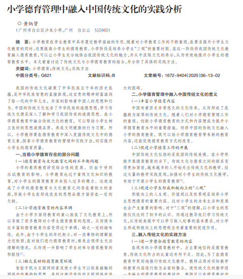 小学教育在学生教育中具有奠定教学基础的作用。随着对小学教育工作的不断重视,在要求提升小学生文 化教育的同时,还要提高小学生的德育教育。小学阶段是培养小学生“三观”的重要时期。在这一阶段将我国传统文化教 育融入德育教育,可以让小学生充分地体会我国传统文化的魅力,并从中汲取文化的养分,从而有效地提升小学生的德 育教育水平。本文着重讨论了传统文化与小学德育教育的结合,并分析了具体的实践方法。