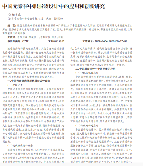 服装设计是中职教育中较为重要的一门课程。对于中国服饰的文化而言,其通常有着深厚文化底蕴与悠久 历史,且形成了多元化的设计风格以及制作工艺。因此,中职院校开展服装设计的过程中,需注重中国元素的应用,以增 强服装设计的创新性。
