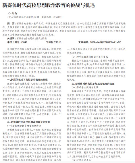 新媒体充分融入教学之后,传统教育方式已经发生改变,在一定程度上加速了我国教育现代化改革的进 程。尤其是在新时期,教育改革机遇和挑战并存,因此本文研究新媒体时代下大学思想政治教育发展面临的挑战,分析 其中存在的机遇,对其进行研究之后提出合理的建议。教师是为国为民、为全天下人素质进行引导的先驱,合理的教育 建议可以带动高校思政教育朝着现代化方向发展。