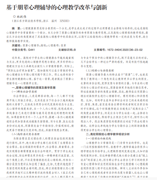 心理健康素质是综合素质的一个分支,是学生成长成才的过程中必须要着力去修炼与培养的,这也是高校 心理教学中非常重要的一个部分。本文分析了朋辈心理辅导的参考原理与教学思想,以及高校心理课程的教学现状,最 后从方法论的角度阐述了其在高校心理教学中的具体应用,以期可以给高校的心理教师带来一定的启发与思考,助力 教师提高教学实效。