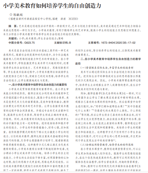 艺术是通过创造性活动开展的一种表现方式,艺术与创造力密切相关,美术就是通过艺术和创造力相结合 来表达思想的一种行为方式。小学美术教育,有利于锻炼学生的艺术审美,提高小学生的创造能力及思维空间想象力。 本文分析在小学美术教育中培养学生的自由创造力的途径及策略。