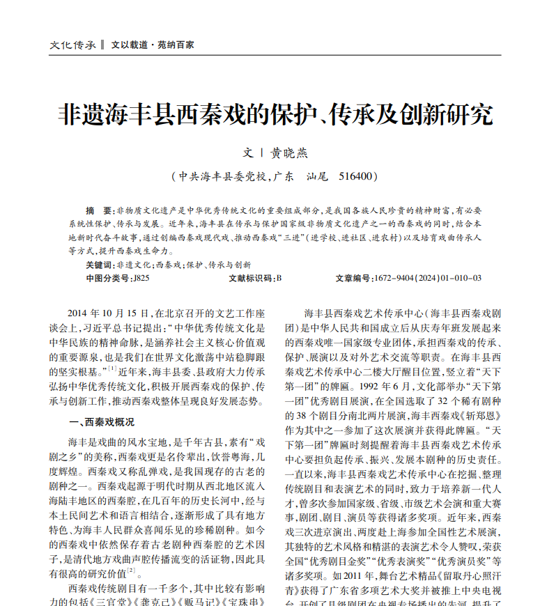 非物质文化遗产是中华优秀传统文化的重要组成部分,是我国各族人民珍贵的精神财富,有必要 系统性保护、传承与发展。近年来,海丰县在传承与保护国家级非物质文化遗产之一的西秦戏的同时,结合本 地新时代奋斗故事,通过创编西秦戏现代戏、推动西秦戏“三进”(进学校、进社区、进农村)以及培育戏曲传承人 等方式,提升西秦戏生命力。