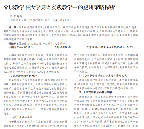 大学英语教学中运用分层教学,能够最大限度地激 发学生潜能,提高学生的学习兴趣。由于学生的个体差异 比较大,每个学生的英语基础不一样,需要教师根据教学 内容运用分层教学法,实现教学目标,切实满足学生的需 求,进而提升学生学习英语的兴趣,提升教学效果。