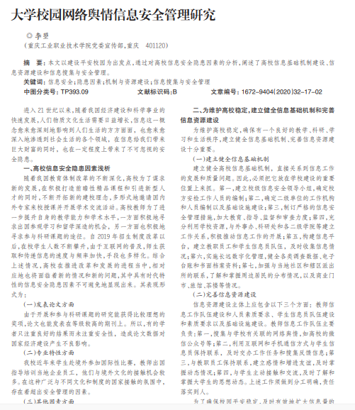 本文以建设平安校园为出发点,通过对高校信息安全隐患因素的分析,阐述了高校信息基础机制建设、信 息资源建设和信息搜集与安全管理。