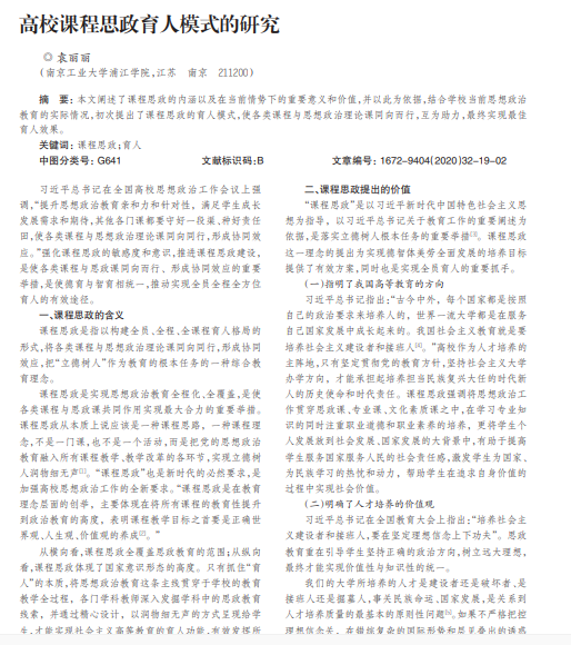 本文阐述了课程思政的内涵以及在当前情势下的重要意义和价值,并以此为依据,结合学校当前思想政治 教育的实际情况,初次提出了课程思政的育人模式,使各类课程与思想政治理论课同向而行,互为助力,最终实现最佳 育人效果。