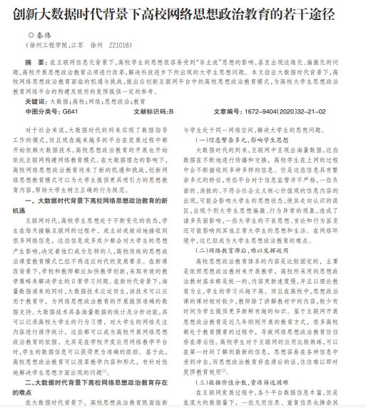 在互联网信息化背景下,高校学生的思想很容易受到“非主流”思想的影响,甚至出现边缘化、偏激化的问 题,高校开展思想政治教育必须进行改革,解决科技进步下所出现的大学生思想问题。本文指出大数据时代背景下,高 校网络思想政治教育面临的机遇与挑战,提出应创新互联网平台中的高校思想政治教育模式,为高校大学生思想政治 教育网络平台的构建及效用的发挥提供一定的参考。