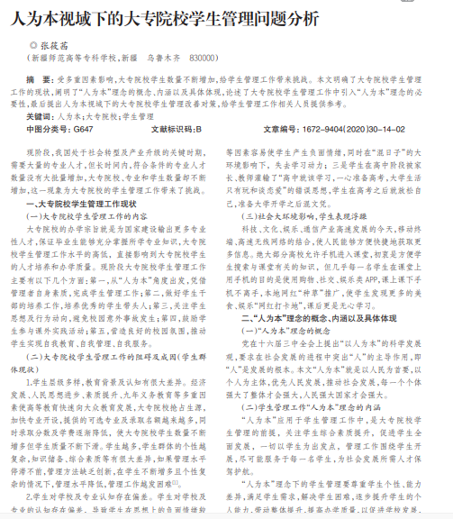 受多重因素影响,大专院校学生数量不断增加,给学生管理工作带来挑战。本文明确了大专院校学生管理 工作的现状,阐明了“人为本”理念的概念、内涵以及具体体现,论述了大专院校学生管理工作中引入“人为本”理念的必 要性,最后提出人为本视域下的大专院校学生管理改善对策,给学生管理工作相关人员提供参考。