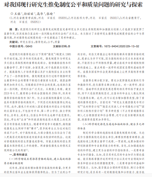 我国现行的研究生推荐免试制度在完善研究生多元招生录取机制和加强拔尖创新人才选拔方面发挥了 显著作用,但其逐渐凸显出的一些问题也受到社会的广泛关注。本文探讨了当前研究生推荐免试制度存在的公平与质 量问题,并对推荐免试制度的进一步完善提出了思考和建议。