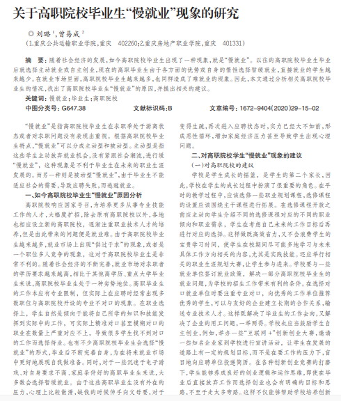 随着社会经济的发展,如今高职院校毕业生出现了一种现象,就是“慢就业”。以往的高职院校毕业生毕业 后就选择主动就业或自主创业,现在的高职毕业生由于各方面的优势或自身的惰性选择暂缓就业,直接就业的学生越 来越少。在就业市场里面,高职院校毕业生越来越多,也同样造成了难就业的现象。因此,本文通过分析相关高职院校毕 业生的情况,找出了高职院校毕业生“慢就业”的原因,并提出相关的建议。
