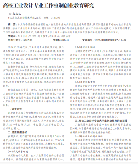 本文结合调查问卷分析影响工业设计专业的大学生创业意向的因素,认识到创业教育对该专业大学生的 重要性。结合工业设计专业的特点,制定出以工作室为核心的创业教育模式,在对工作室的创建模式、工作室的指导者、 工作室的指导对象的探析中,总结提升工业设计专业大学生的创业能力以及完善创业教育课题体系的方法。