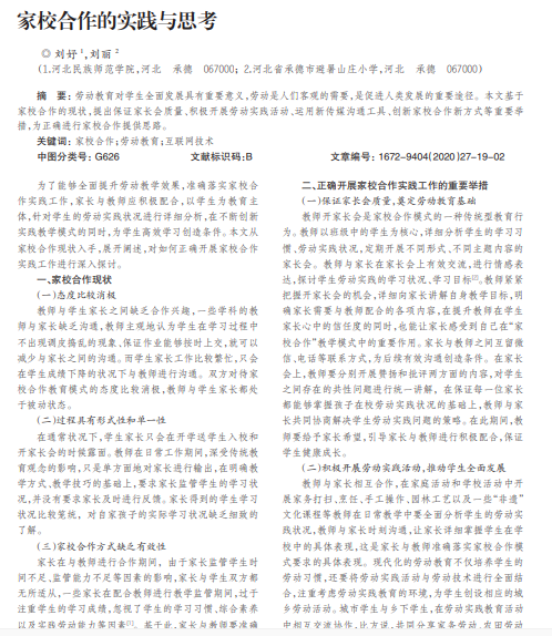 劳动教育对学生全面发展具有重要意义,劳动是人们客观的需要,是促进人类发展的重要途径。本文基于 家校合作的现状,提出保证家长会质量、积极开展劳动实践活动、运用新传媒沟通工具、创新家校合作新方式等重要举 措,为正确进行家校合作提供思路。