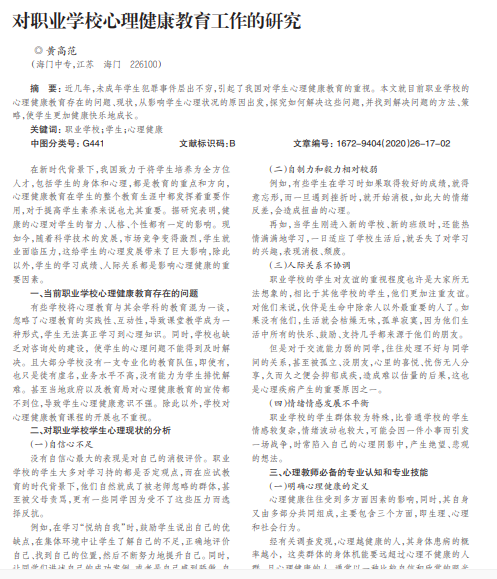 近几年,未成年学生犯罪事件层出不穷,引起了我国对学生心理健康教育的重视。本文就目前职业学校的 心理健康教育存在的问题、现状,从影响学生心理状况的原因出发,探究如何解决这些问题,并找到解决问题的方法、策 略,使学生更加健康快乐地成长。