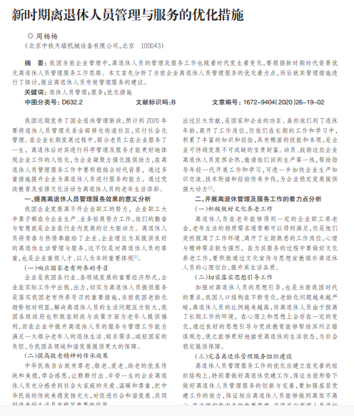 我国当前企业管理中,离退休人员的管理及服务工作也随着时代发生着变化,要根据新时期时代背景优 化离退休人员管理服务工作思路。本文首先分析了当前企业离退休人员管理服务的优化着力点,而后就其管理措施进 行了探讨,提出离退休人员有效管理服务的建议。