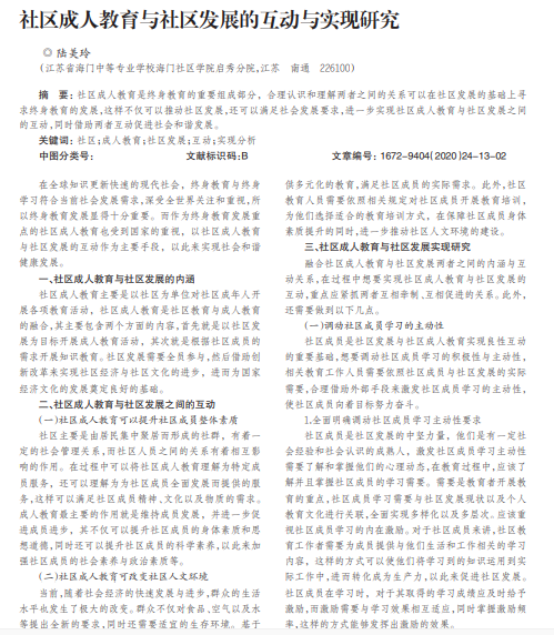 社区成人教育是终身教育的重要组成部分,合理认识和理解两者之间的关系可以在社区发展的基础上寻 求终身教育的发展,这样不仅可以推动社区发展,还可以满足社会发展要求,进一步实现社区成人教育与社区发展之间 的互动,同时借助两者互动促进社会和谐发展。
