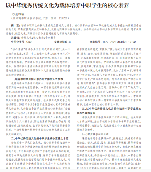 培养中职学生的核心素养是立德树人之根本。核心素养的内涵和中华优秀传统文化中蕴含的精神涵养有 相通之处,只要挖掘到契合点和融合点,就能达到事半功倍的效果。结合学校的办学特点和中职学生的特点,笔者从课 堂教学、校园文化、实践活动三个方面阐述行之有效的具体策略。