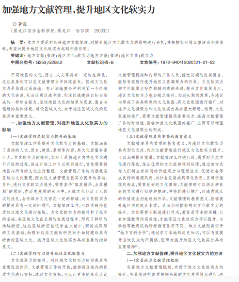 本文主要是对加强地方文献管理,对提升地区文化软实力的影响进行分析,并根据实际情况整理出相关策 略,希望对提升地区文化软实力起到积极作用。