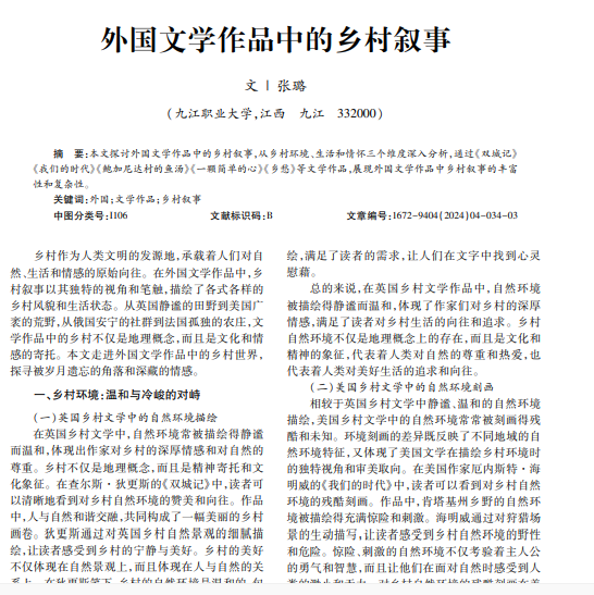 本文探讨外国文学作品中的乡村叙事,从乡村环境、生活和情怀三个维度深入分析,通过《双城记》 《我们的时代》《鲍加尼达村的鱼汤》《一颗简单的心》《乡愁》等文学作品,展现外国文学作品中乡村叙事的丰富 性和复杂性。