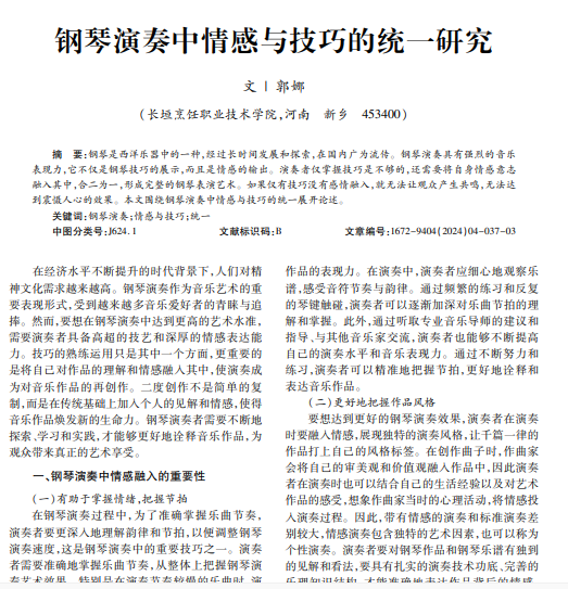 钢琴是西洋乐器中的一种,经过长时间发展和探索,在国内广为流传。钢琴演奏具有强烈的音乐 表现力,它不仅是钢琴技巧的展示,而且是情感的输出。演奏者仅掌握技巧是不够的,还需要将自身情感意志 融入其中,合二为一,形成完整的钢琴表演艺术。如果仅有技巧没有感情融入,就无法让观众产生共鸣,无法达 到震慑人心的效果。本文围绕钢琴演奏中情感与技巧的统一展开论述。