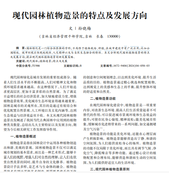 园林绿化是一门综合性很强的学科,不局限于植物栽培、种植,在城市建设中有广泛应用,比如公 园绿地。城市环境应体现地域性、人文精神以及与自然生态融合的特性。本文分析现代园林植物造景的特点 及发展方向,提出现代园林植物造景创新发展策略。