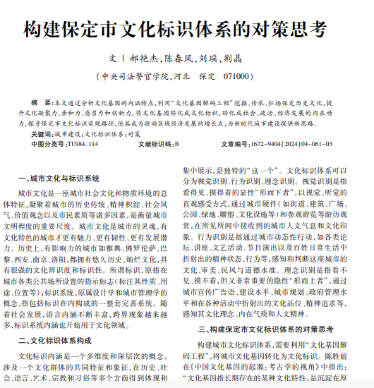 本文通过分析文化基因的内涵特点,利用“文化基因解码工程”挖掘、传承、弘扬保定历史文化,提 升文化凝聚力、亲和力、感召力和创新力,将文化基因转化成文化标识,转化成社会、政治、经济发展的内在动 力,探寻保定市文化标识实现路径,使其成为推动区域经济发展的增长点,为新时代城市建设提供新思路。