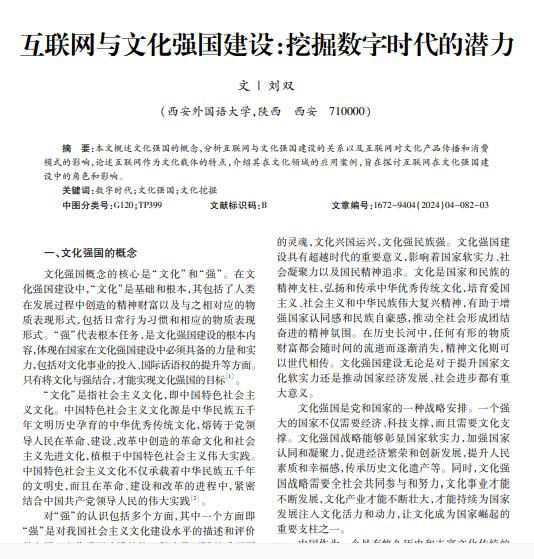 本文概述文化强国的概念,分析互联网与文化强国建设的关系以及互联网对文化产品传播和消费 模式的影响,论述互联网作为文化载体的特点,介绍其在文化领域的应用案例,旨在探讨互联网在文化强国建 设中的角色和影响。