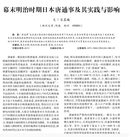 “唐通事”是在德川幕府推行锁国政策的背景下形成的,依靠长崎贸易不断发展形成了成熟体制。 本文系统梳理唐通事的形成与发展,条理性地阐述唐通事的具体职责,从唐通事的职责与实践活动分析其发挥 的不同作用,探寻唐通事在明治维新以及国际交往方面的影响,对研究中日贸易及文化交流具有重要意义。
