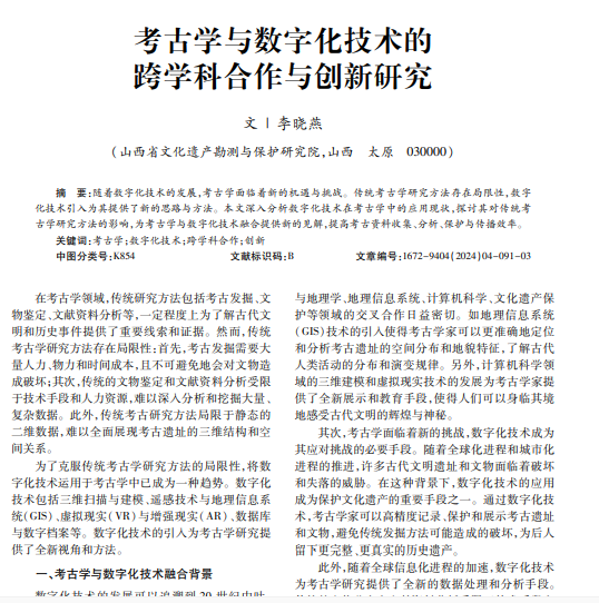 随着数字化技术的发展,考古学面临着新的机遇与挑战。传统考古学研究方法存在局限性,数字 化技术引入为其提供了新的思路与方法。本文深入分析数字化技术在考古学中的应用现状,探讨其对传统考 古学研究方法的影响,为考古学与数字化技术融合提供新的见解,提高考古资料收集、分析、保护与传播效率。