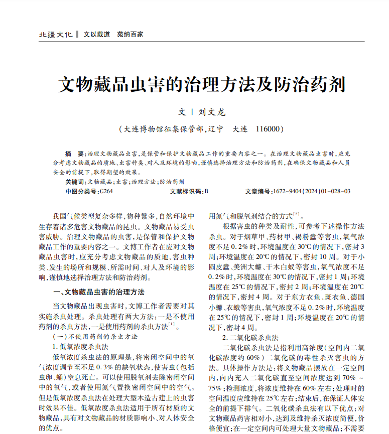 治理文物藏品虫害,是保管和保护文物藏品工作的重要内容之一。在治理文物藏品虫害时,应充 分考虑文物藏品的质地、虫害种类、对人及环境的影响,谨慎选择治理方法和防治药剂,在确保文物藏品和人员 安全的前提下,取得期望的效果。