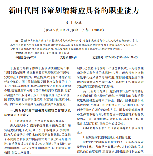 图书出版行业在为人们提供优质文化服务的同时,肩负着展现国内外文化风貌的重要任务。本文 基于当前新时代对图书出版行业提出的新要求,从图书策划编辑职业能力提升对图书行业以及个人意义入手, 分析图书策划编辑应具备的职业能力,旨在帮助图书策划编辑明确自身职责,不断提升综合能力。