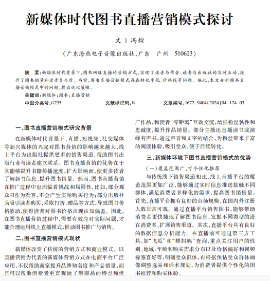 新媒体时代背景下,图书网络直播的营销方式,实现了读者与作者、读者与出版社的实时互动,提 升了图书销量和读者参与度。当前,图书直播营销模式存在转化率低、价格战等问题。据此,本文分析图书直 播营销模式中的问题,提出优化策略。