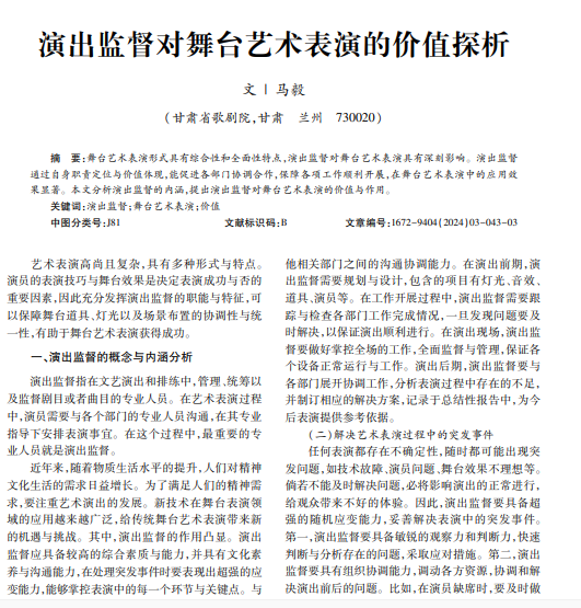 舞台艺术表演形式具有综合性和全面性特点,演出监督对舞台艺术表演具有深刻影响。演出监督 通过自身职责定位与价值体现,能促进各部门协调合作,保障各项工作顺利开展,在舞台艺术表演中的应用效 果显著。本文分析演出监督的内涵,提出演出监督对舞台艺术表演的价值与作用。