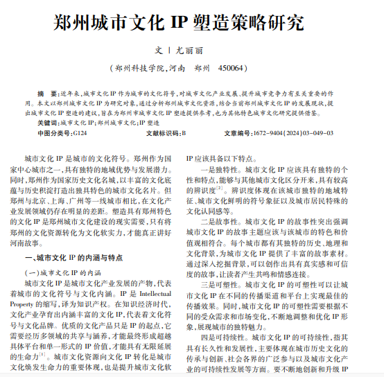 近年来,城市文化 IP作为城市的文化符号,对城市文化产业发展、提升城市竞争力有至关重要的作 用。本文以郑州城市文化 IP为研究对象,通过分析郑州城市文化资源,结合当前郑州城市文化 IP的发展现状,提 出城市文化 IP塑造的建议,旨在为郑州市城市文化 IP塑造提供参考,也为其他特色城市文化研究提供借鉴。