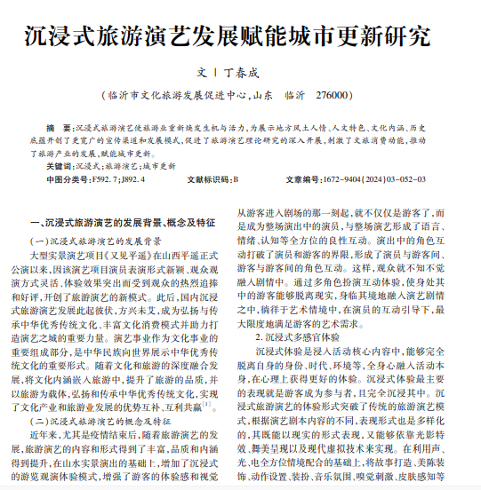 沉浸式旅游演艺使旅游业重新焕发生机与活力,为展示地方风土人情、人文特色、文化内涵、历史 底蕴开创了更宽广的宣传渠道和发展模式,促进了旅游演艺理论研究的深入开展,刺激了文旅消费动能,推动 了旅游产业的发展,赋能城市更新。