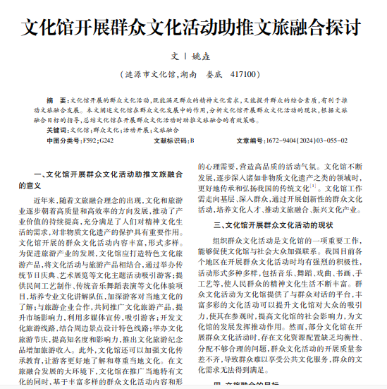 文化馆开展的群众文化活动,既能满足群众的精神文化需求,又能提升群众的综合素质,有利于推 动文旅融合发展。本文阐述文化馆在群众文化发展中的作用,分析文化馆开展群众文化活动的现状,根据文旅 融合目标的指导,总结文化馆在开展群众文化活动时助推文旅融合的有效策略。