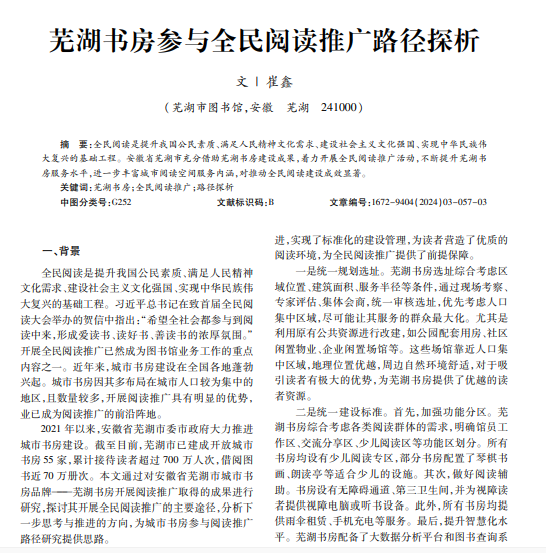 全民阅读是提升我国公民素质、满足人民精神文化需求、建设社会主义文化强国、实现中华民族伟 大复兴的基础工程。安徽省芜湖市充分借助芜湖书房建设成果,着力开展全民阅读推广活动,不断提升芜湖书 房服务水平,进一步丰富城市阅读空间服务内涵,对推动全民阅读建设成效显著。