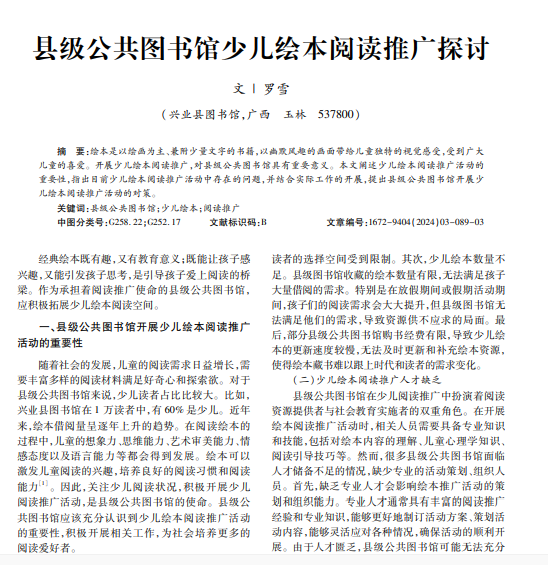 绘本是以绘画为主、兼附少量文字的书籍,以幽默风趣的画面带给儿童独特的视觉感受,受到广大 儿童的喜爱。开展少儿绘本阅读推广,对县级公共图书馆具有重要意义。本文阐述少儿绘本阅读推广活动的 重要性,指出目前少儿绘本阅读推广活动中存在的问题,并结合实际工作的开展,提出县级公共图书馆开展少 儿绘本阅读推广活动的对策。