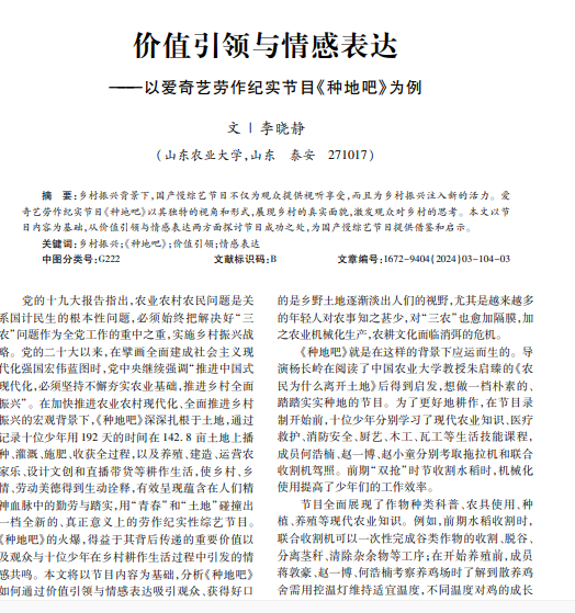 乡村振兴背景下,国产慢综艺节目不仅为观众提供视听享受,而且为乡村振兴注入新的活力。爱 奇艺劳作纪实节目《种地吧》以其独特的视角和形式,展现乡村的真实面貌,激发观众对乡村的思考。本文以节 目内容为基础,从价值引领与情感表达两方面探讨节目成功之处,为国产慢综艺节目提供借鉴和启示。