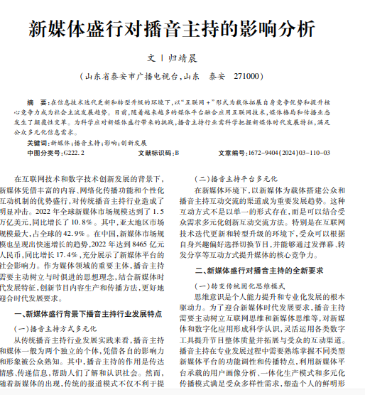 在信息技术迭代更新和转型升级的环境下,以“互联网 +”形式为载体拓展自身竞争优势和提升核 心竞争力成为社会主流发展趋势。目前,随着越来越多的媒体平台融合应用互联网技术,媒体格局和传播业态 发生了颠覆性变革。为科学应对新媒体盛行带来的挑战,播音主持行业需科学把握新媒体时代发展特征,满足 公众多元化信息需求。