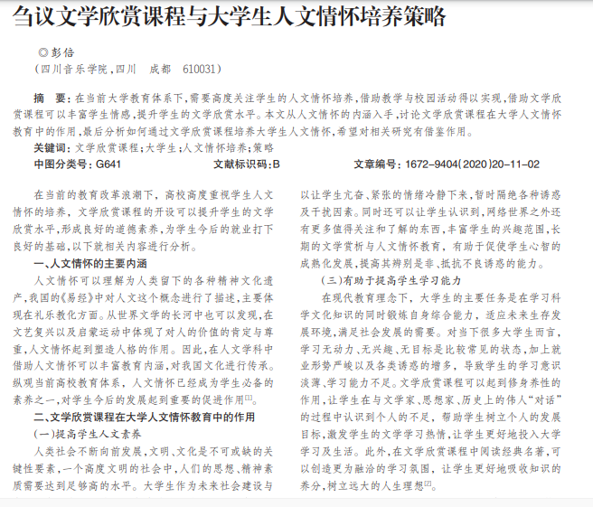 在当前大学教育体系下,需要高度关注学生的人文情怀培养,借助教学与校园活动得以实现,借助文学欣 赏课程可以丰富学生情感,提升学生的文学欣赏水平。本文从人文情怀的内涵入手,讨论文学欣赏课程在大学人文情怀 教育中的作用,最后分析如何通过文学欣赏课程培养大学生人文情怀,希望对相关研究有借鉴作用。