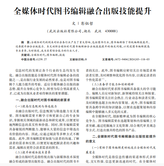 全媒体时代的到来对社会各行业产生了重大影响,包括图书行业,图书编辑除了传统编辑技能外, 还要提升融合出版能力。本文剖析全媒体时代图书编辑融合出版技能提升的相关问题,以促进图书编辑提高 专业素养,与时俱进,成为具有综合能力的行业人才。