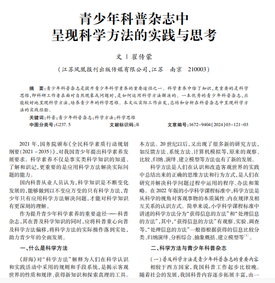 青少年科普杂志是提升青少年科学素养的重要途径之一。科学素养中除了知识,更重要的是科学 思维,即科研工作者在面对自然现象或问题时,是如何运用科学方法解决的。一本优秀的青少年科普杂志,应 能较好地呈现科学方法,培养青少年的科学思维。本文从实际工作出发,总结和分析在科普杂志中呈现科学方 法的实践经验。