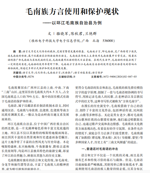 语言文字是文化传承的载体,是国家繁荣发展的根基。毛南族方言,即毛南语,是广西特有少数民 族毛南族的母语,属于汉藏语系壮侗语族侗水语支。毛南族在传统上主要使用毛南语展开日常交流。随着汉 语的推广和毛南族与其他民族的交流,毛南族兼用汉语的情况日益普遍。在现代生活中,毛南语的功能出现了 一定程度的衰退,毛南语的使用率有所下降。毛南族方言在环江毛南族自治县的使用受到汉语普及的影响而 面临挑战,须通过多种方式保护和促进其健康发展。