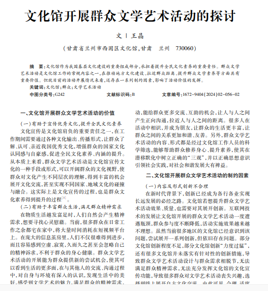 文化馆作为我国基层文化建设的重要组成部分,承担着提升全民文化素养的重要责任。群众文学 艺术活动是文化馆工作的常规内容之一,在推动地方文化建设、拉近群众距离、提升群众文学素养等方面具有 重要价值。但就目前的活动开展情况来看,还存在一系列制约因素,影响了活动价值的发挥。