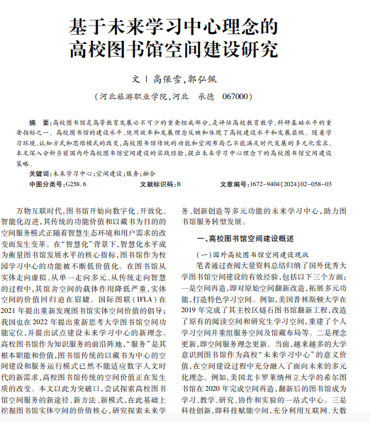 高校图书馆是高等教育发展必不可少的重要组成部分,是评估高校教育教学、科研基础水平的重 要指标之一。高校图书馆的建设水平、使用效率和发展理念反映和体现了高校建设水平和发展层级。随着学 习环境、认知方式和思维模式的改变,高校图书馆传统的功能和空间布局已不能满足时代发展的多元化需求。 本文深入分析当前国内外高校图书馆空间建设的实践经验,提出未来学习中心理念下的高校图书馆空间建设 策略。